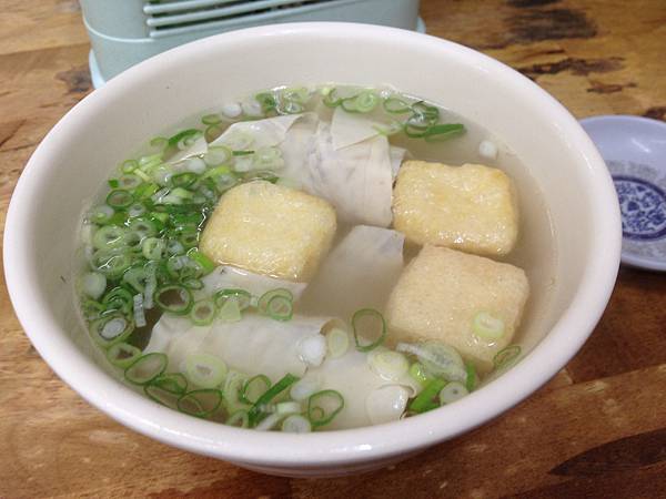 油豆腐細粉湯裡,百頁裡包著豬絞肉加蝦米調製的肉餡,很特別,